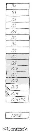> R0~R12는 ContextDaughter 마음대로 주물럭 거릴 테고, R13은 역시 철없는 ContextDuaghter가 Data를 Push/ pop한 만큼 증가되거나, 감소될 거구요. R14는 만질 수도 있고, 안만질 수도 있고요. 물론 PC (R15)는 branch를 했으니까 값이 바뀌겠죠.